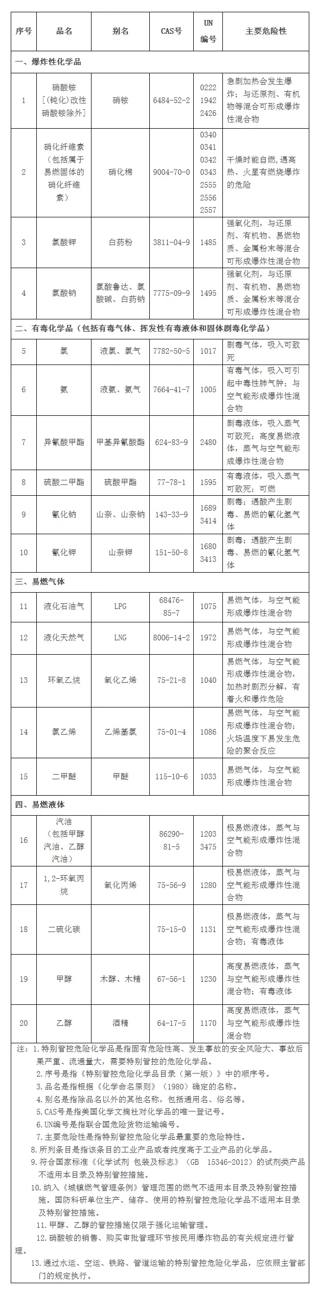 为认真贯彻落实《危险化学品安全综合治理方案》,深刻吸取事故教训,加强危险化学品全生命周期管理,强化安全风险防控,有效防范遏制重特大事故,切实保障人民群众生命和财产安全,应急管理部、工业和信息化部、公安部、交通运输部联合制定了《特别管控危险化学品目录(第一版)》,现予公告。
